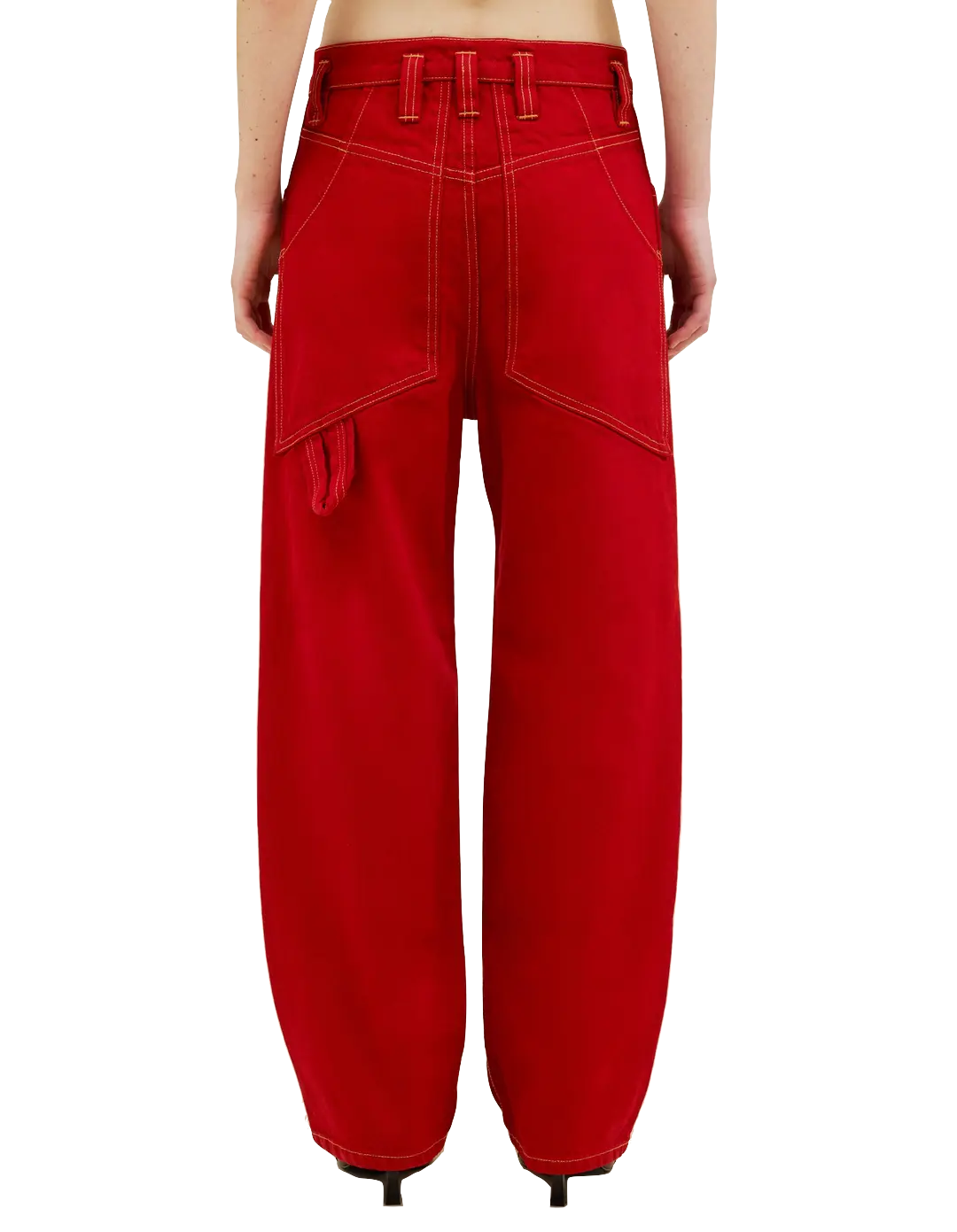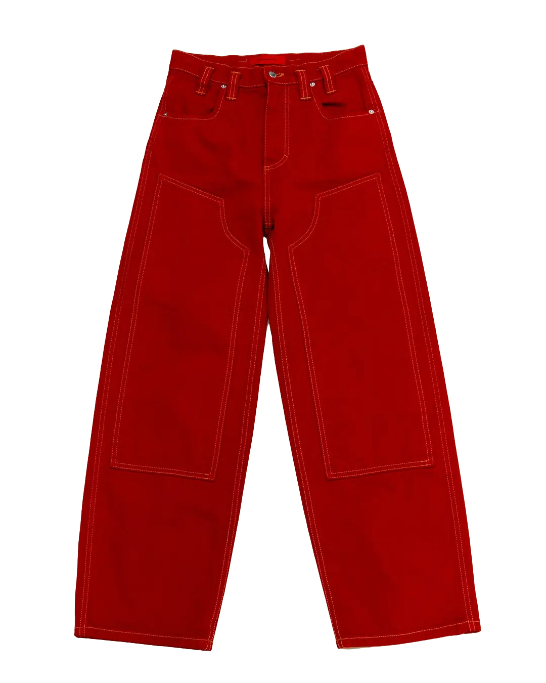 Eckhaus Latta SS26 Relaxed-fit jean in 14oz cotton indigo denim, stripped and overdyed a bright red. Features signature oversized EL back pockets, double knee patch, hammer loop on the back left pocket, and a 28" inseam for sizes 24–36.