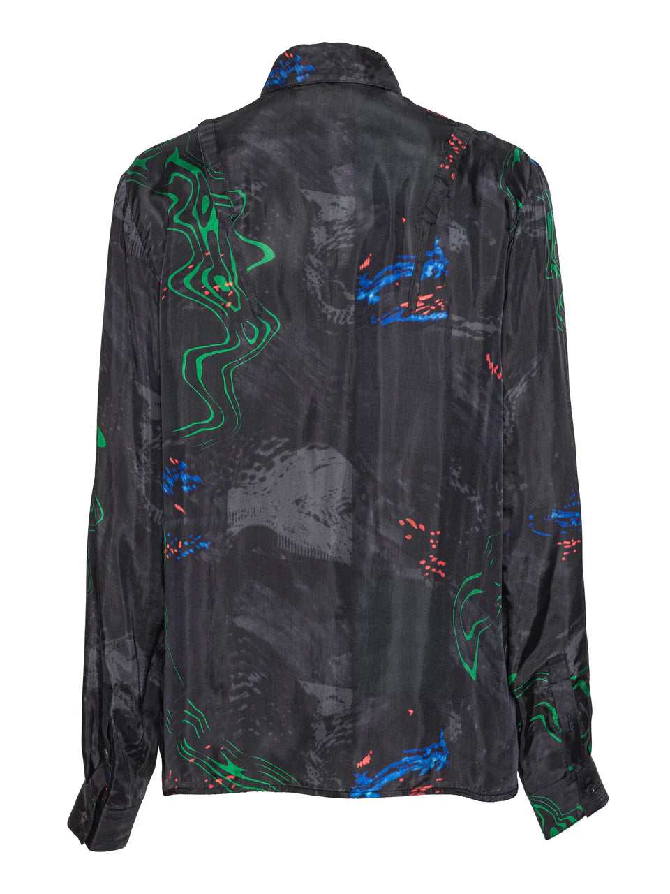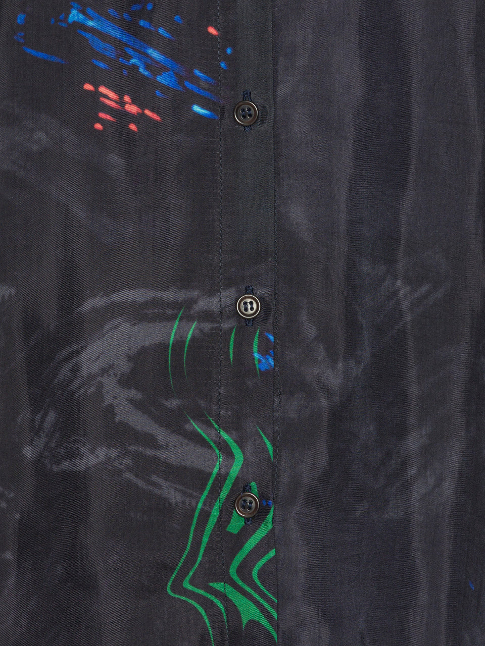 Henrik Vibskov A/W 2025 collared shirt with abstract firework pattern and straight hem.