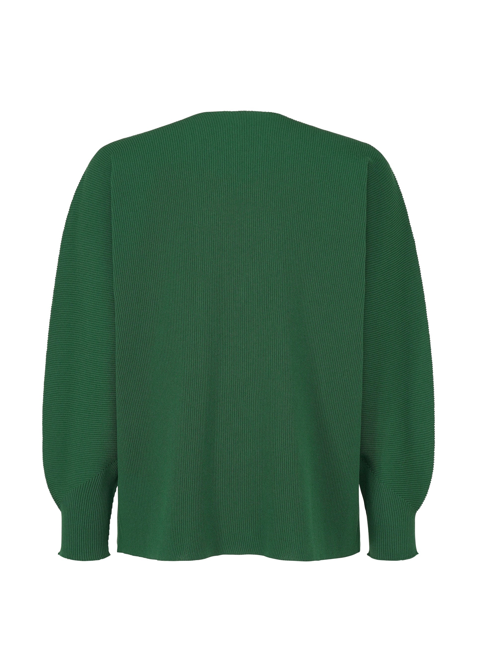 HOMME PLISSÉ ISSEY MIYAKE S/S 2026 pleated green knit cardigan with v-neckline and button fastenings. This green cardigan has a V-neckline and button fastenings.