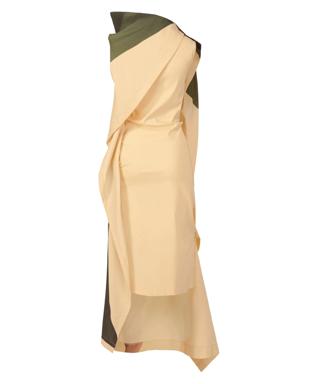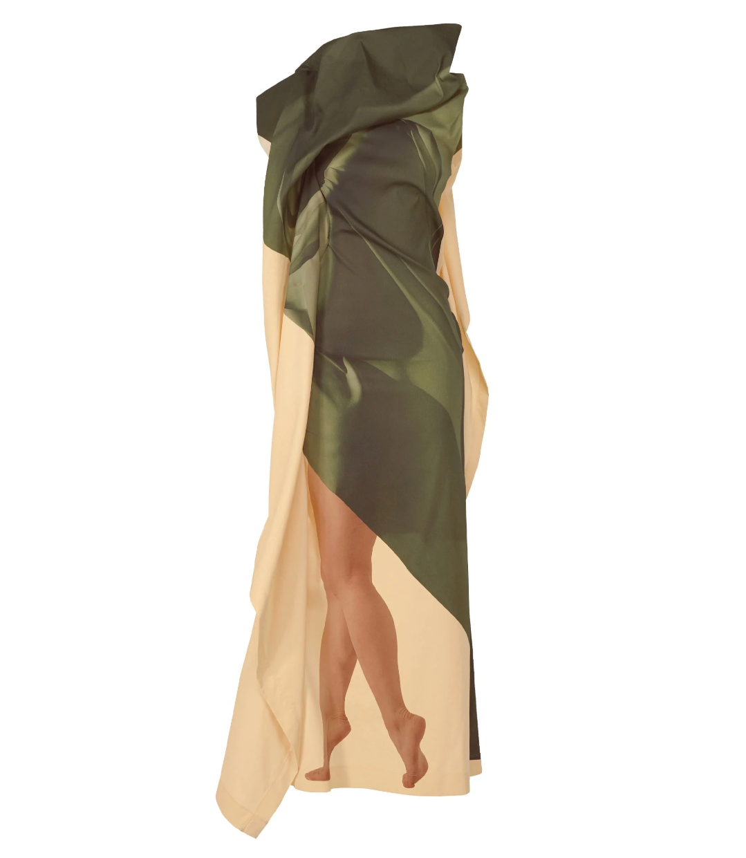 A sleeveless dress printed with a pattern created based on the silhouette of the human body interacting with a single piece of cloth. The pattern was created by photographing a dancer moving behind fabric fluttering in the wind. At first glance, it appears to be a photograph of fabric with intricate wrinkles, but faint shadows of hands and feet are visible from behind the fabric, with bare feet peeking through, evoking a sense of presence of a physical body. The original pattern, coupled with the structure of the dress, creates an even more intricate interplay between body, fabric, and garment when worn. Made with finely ribbed stretch material, this piece pursues a new relationship between the body and cloth.