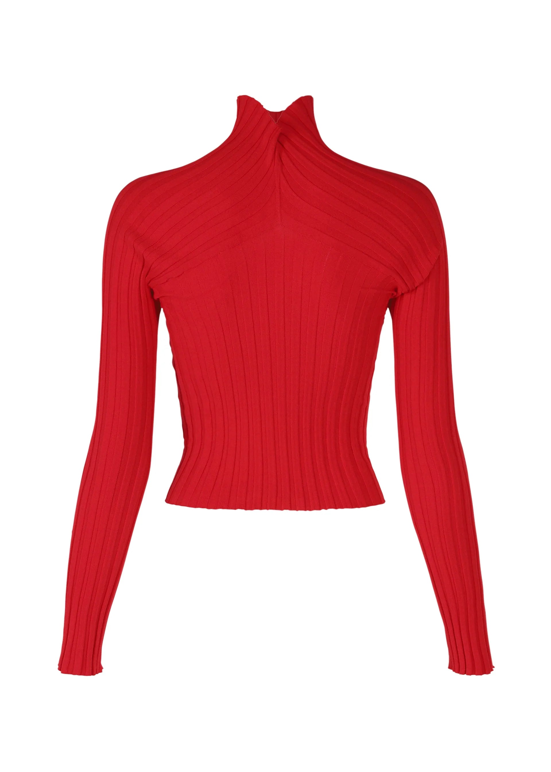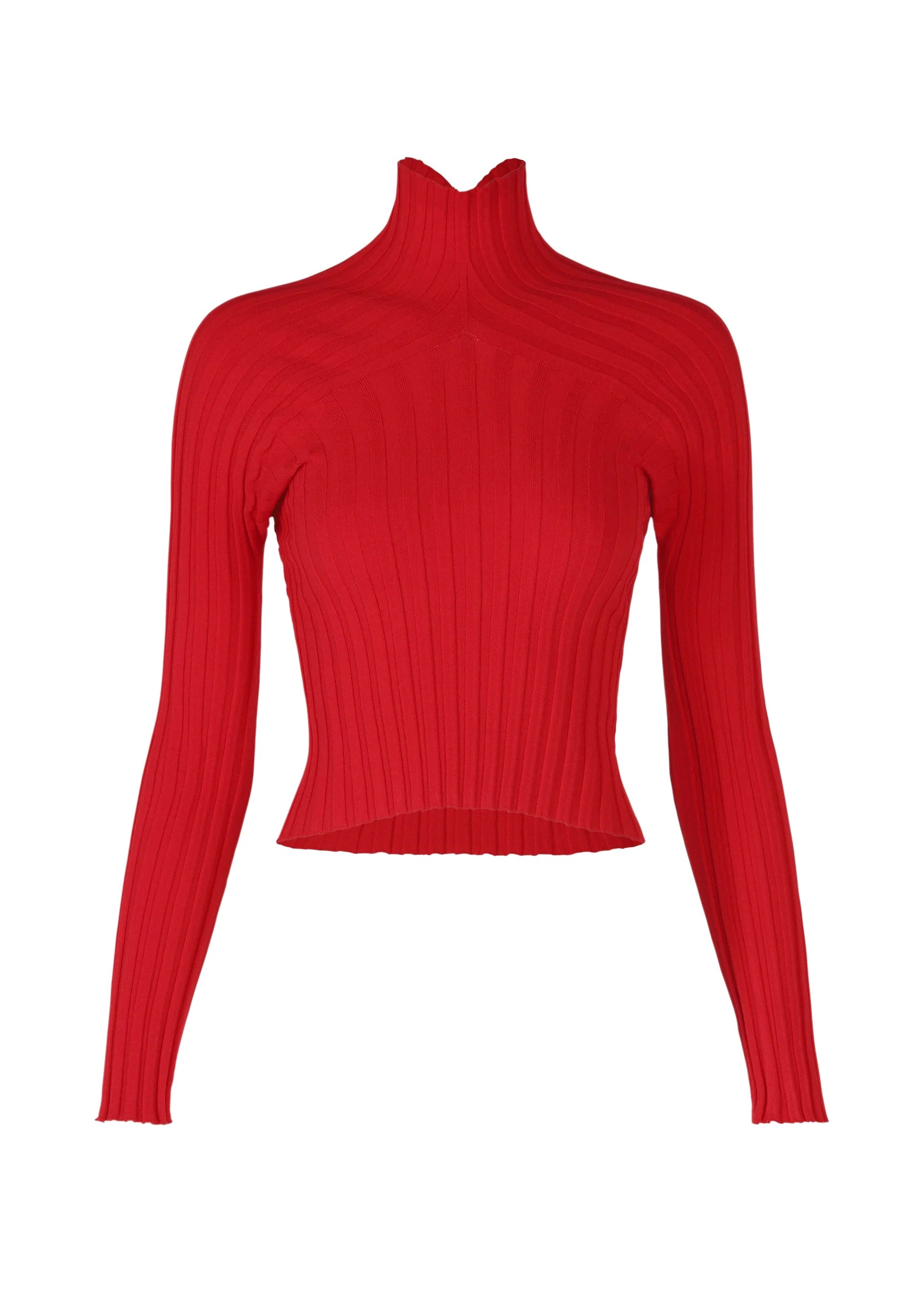 ISSEY MIYAKE S/S 2026 cropped red knit top with long sleeves and high neck.