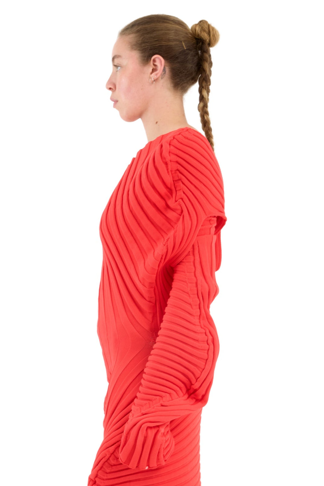 · Sculptural rib-knit arm covers· Twisted Rib Construction gives 3-Dimensional Form· Soft, stretchable texture provides structure· Exploring the space between body and garmentDesigner color: Red