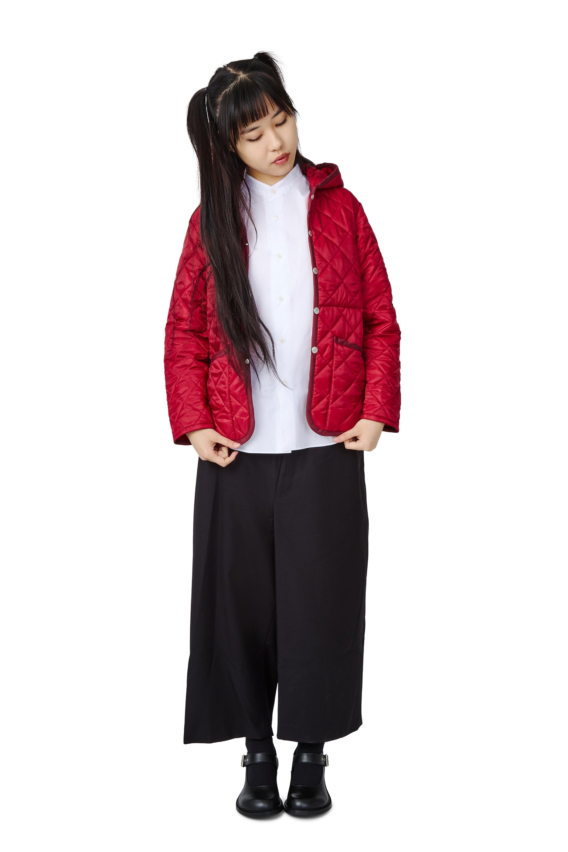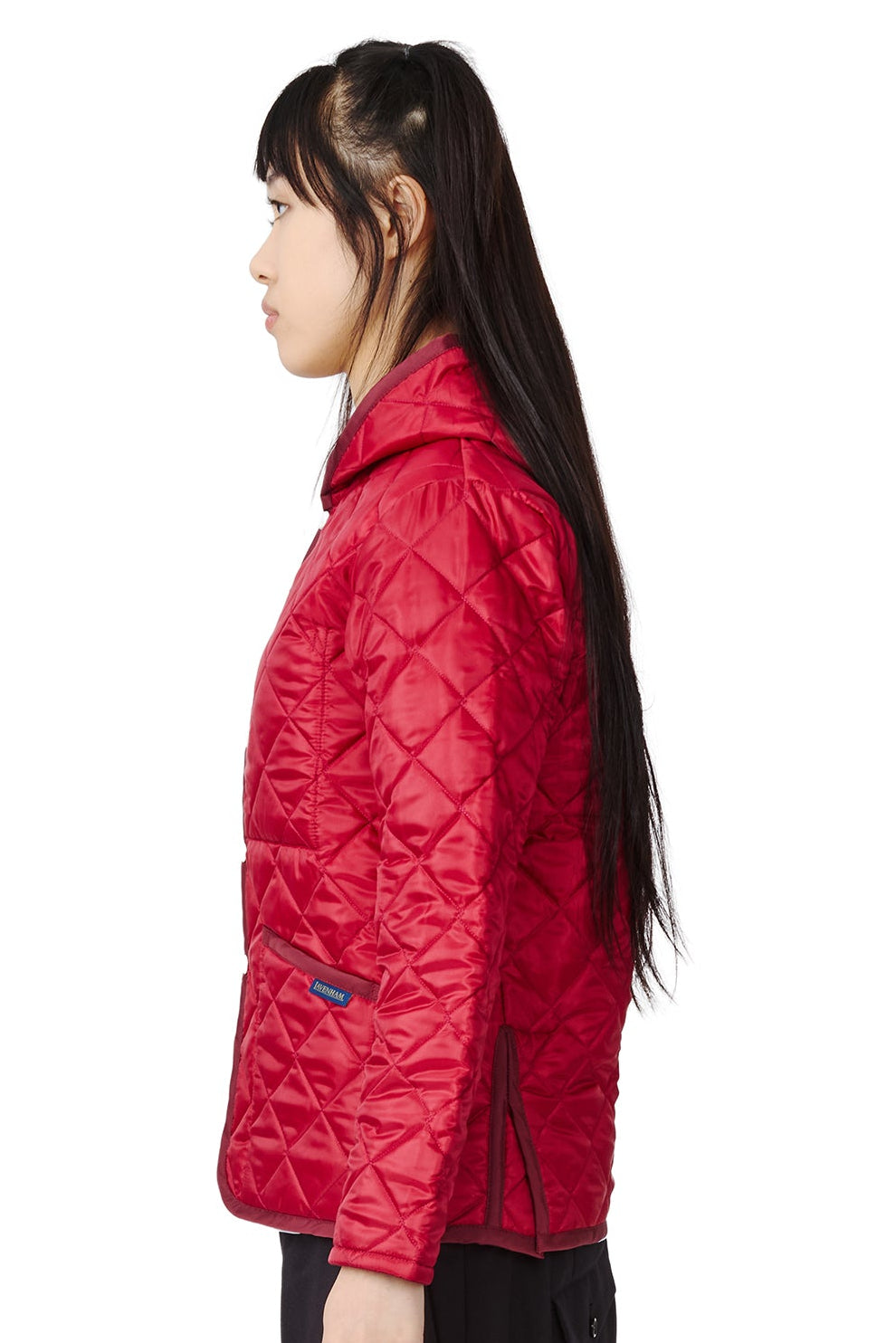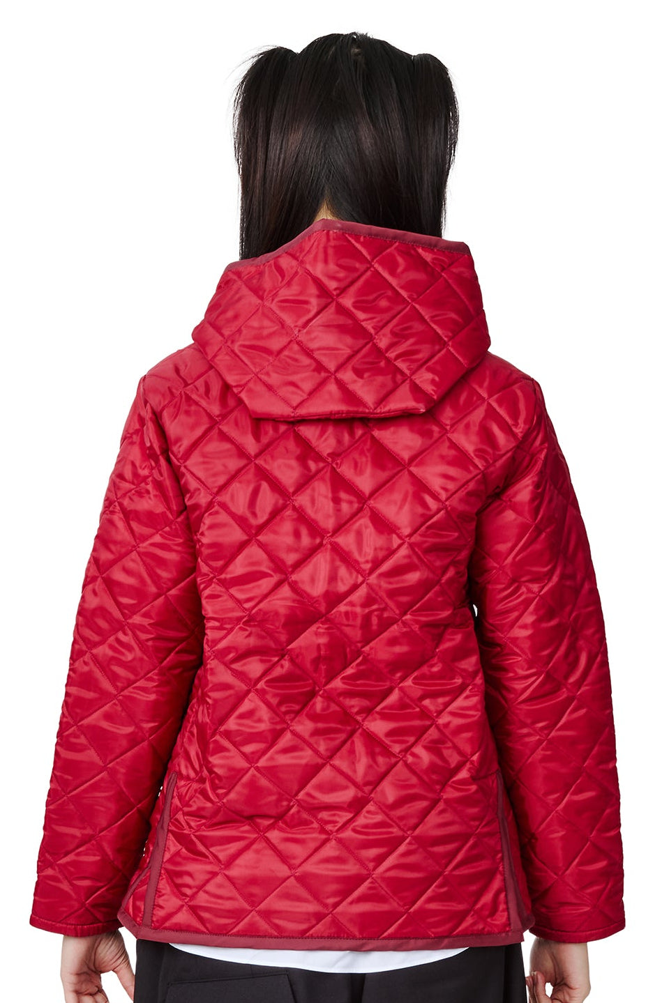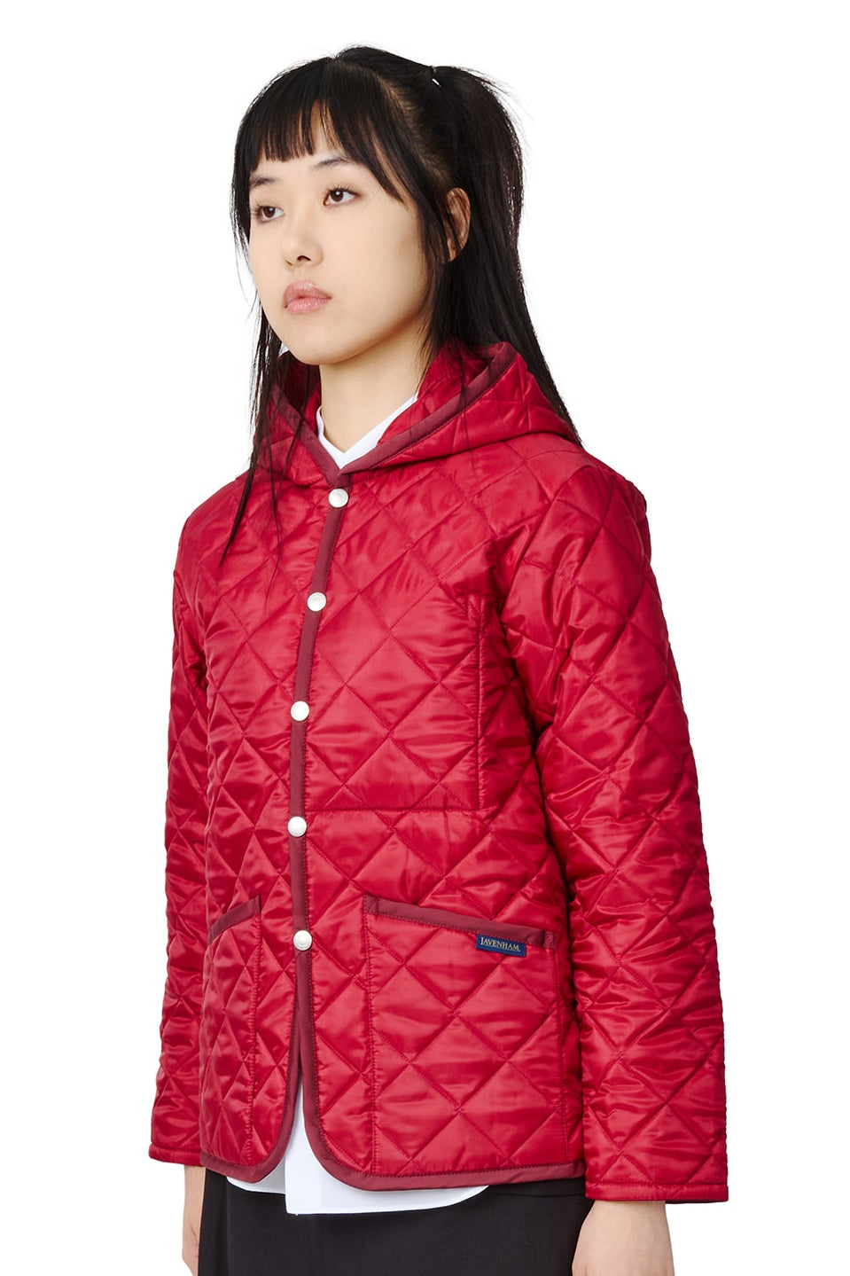 COMME des GARÇONS GIRL x Lavenham A/W 2025 Red Quilted Jacket with classic hood, button fastening, and front pockets.