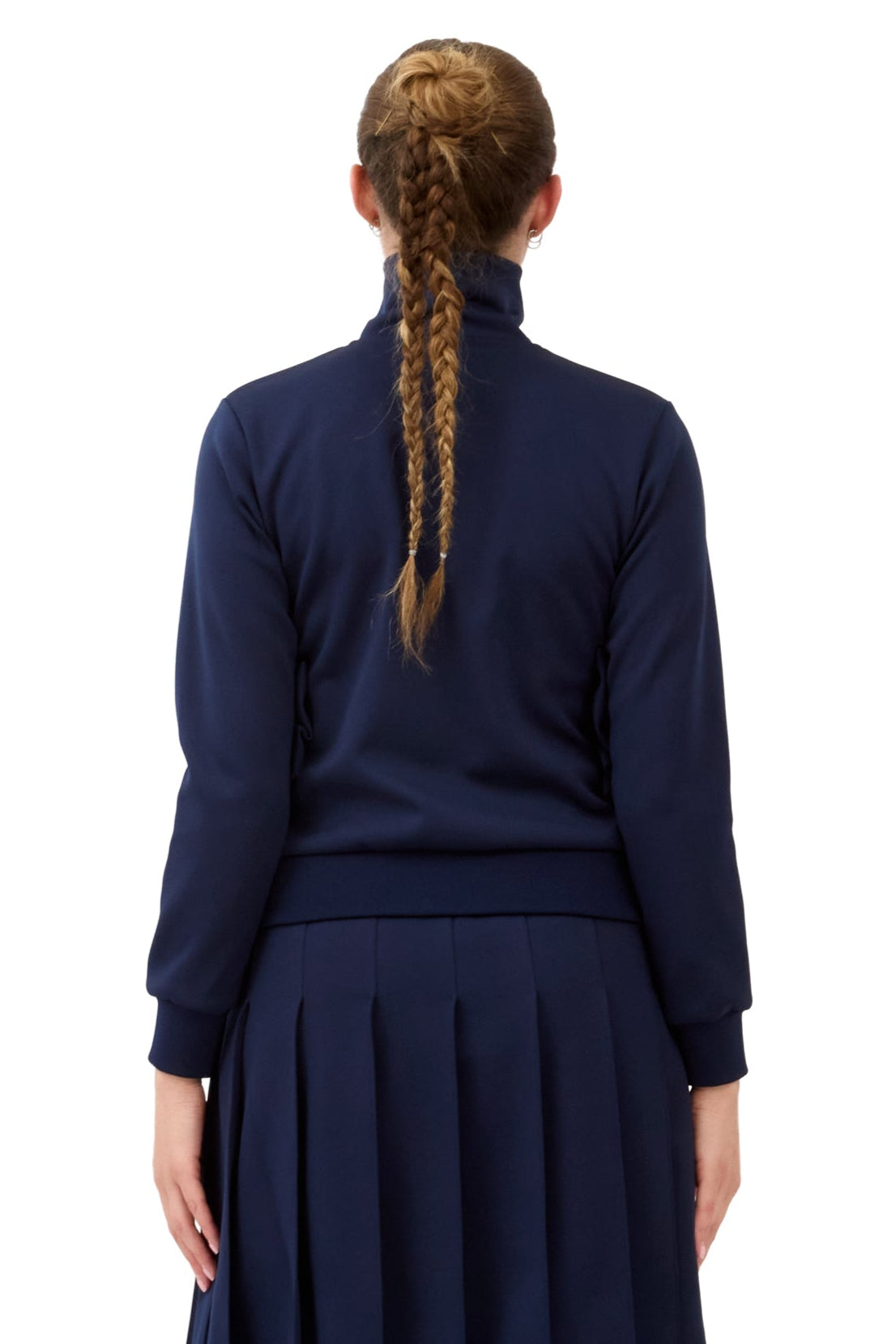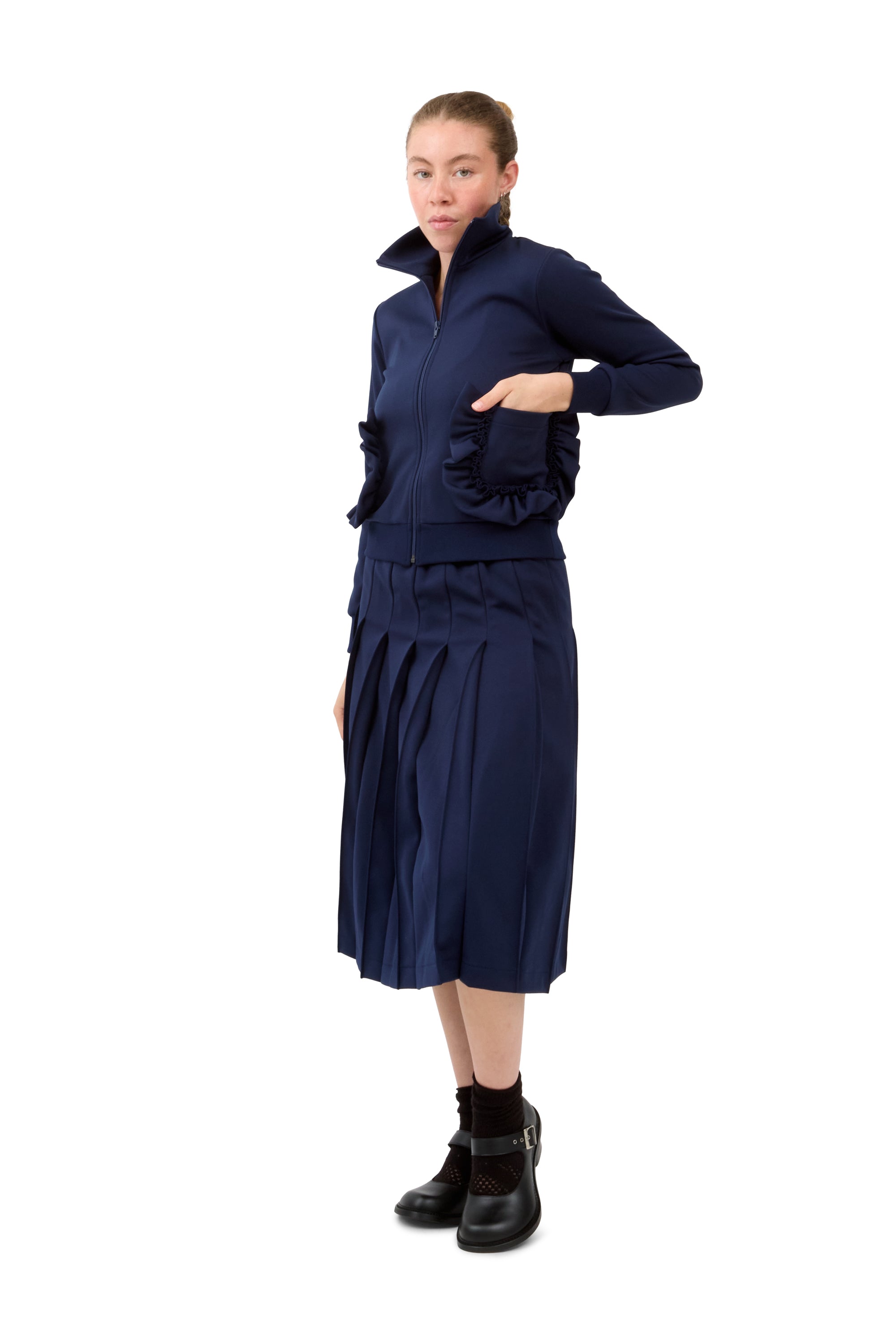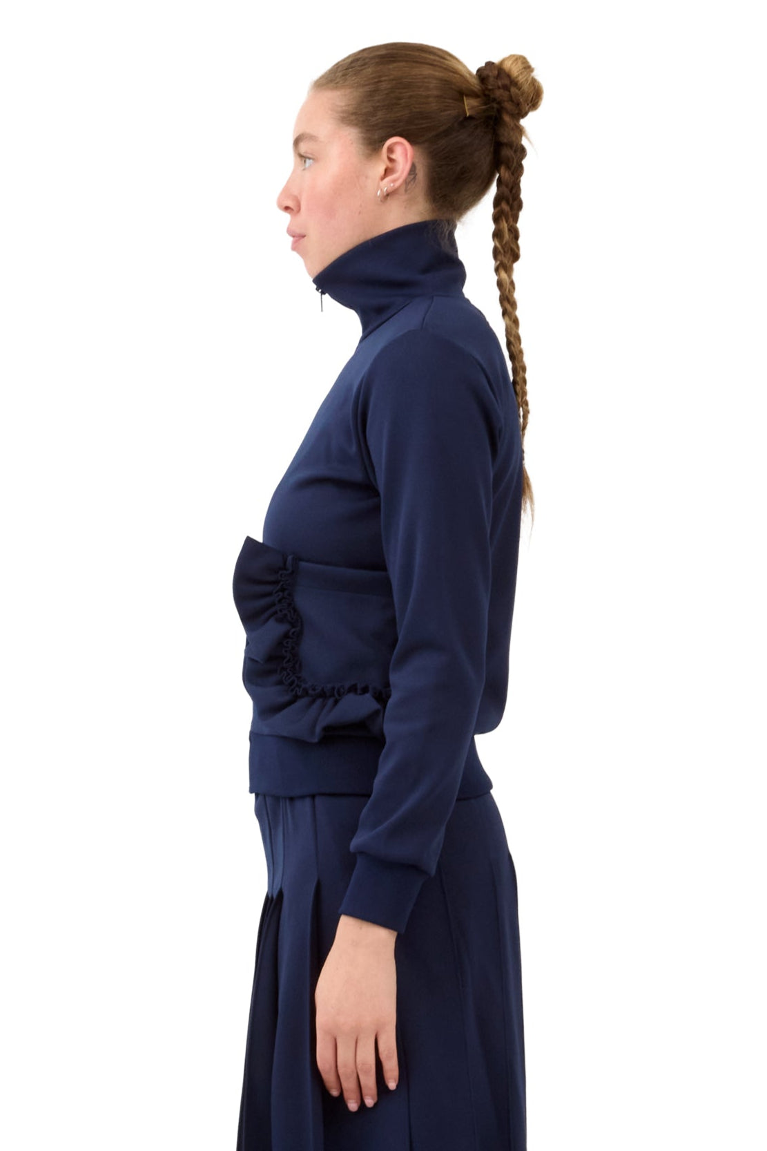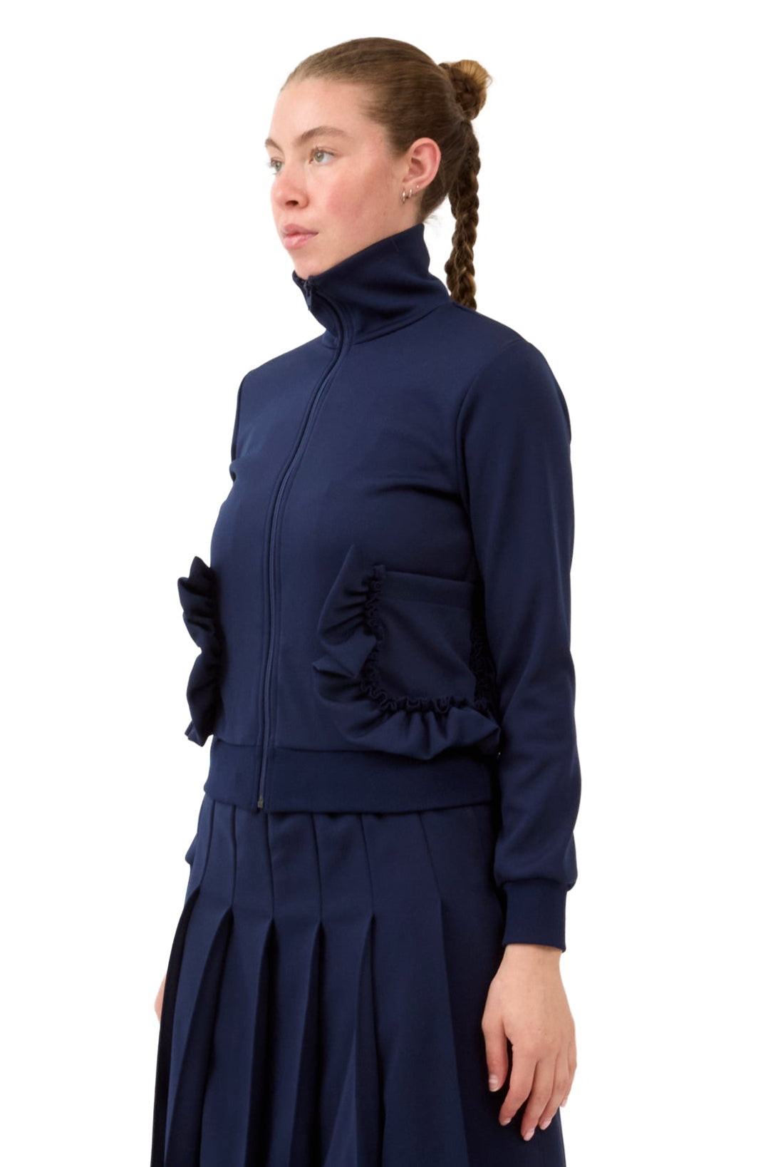 COMME des GARÇONS GIRL A/W 2025 Navy track jacket with ruched pocket detailing, high-neck collar, zippered front closure, and ribbed detailing at cuffs and waist.